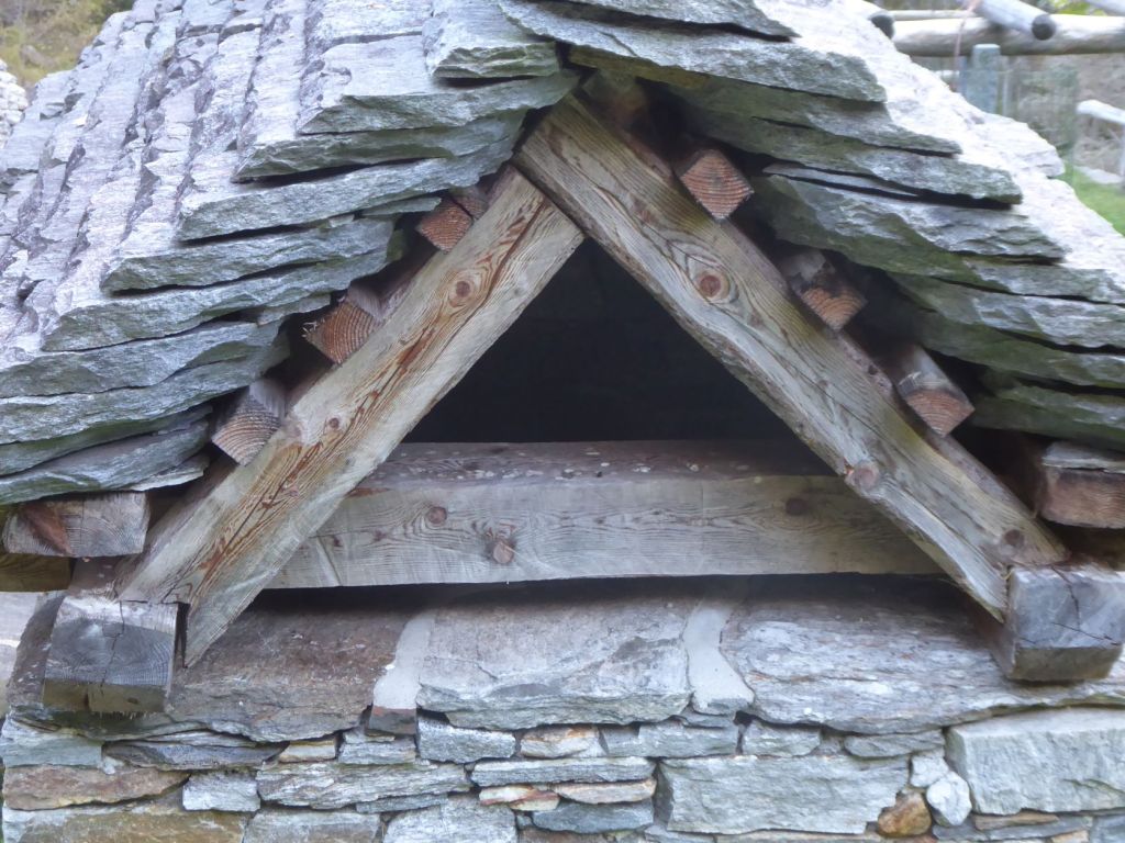 Dächer Verzascatal: Die Dächer der Steinhäuser im Valle Verzasca sind aus Granit oder Gneis gefertigt. Der Stein wird dazu zu Platten gehauen und fast horizontal auf einer soliden Holzstruktur, gewöhnlich aus Lärchen- oder Tannenholz, schräg übereinander gestapelt. Schon eine einzelne Steinplatte, «pioda» genannt, wiegt etwa 50 Kilogramm. Diese Art der Dachdeckung im Tessin ist mit 1.000 CHF pro Quadratmeter (7 bis 8 Steinplatten sind pro qm nötig) heutzutage zwar durchaus kostspielig, dafür aber zuverlässig und langlebig wie in alten Zeiten. Bis zu 300 Jahre kann ein so gedecktes Steindach überdauern.