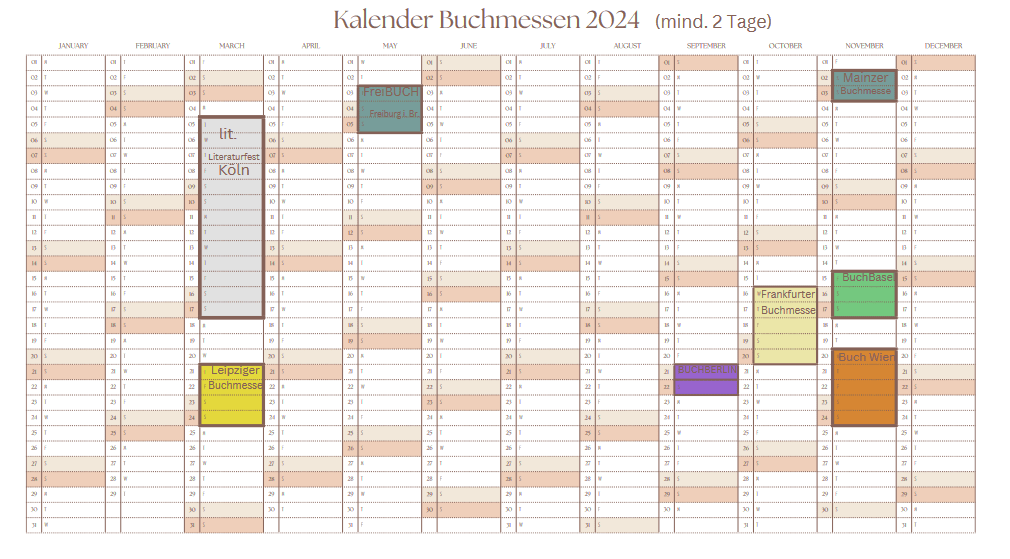 Daher habe ich mir selbst kurzerhand einen übersichtlichen Buchmessen Kalender für 2024 erstellt, den ich hier gern teile und der jederzeit mit Terminen erweitert werden darf und soll. Schreibt mir / hinterlasst ein Kommentar und ich nehme gern weitere Buchmessen Daten auf.