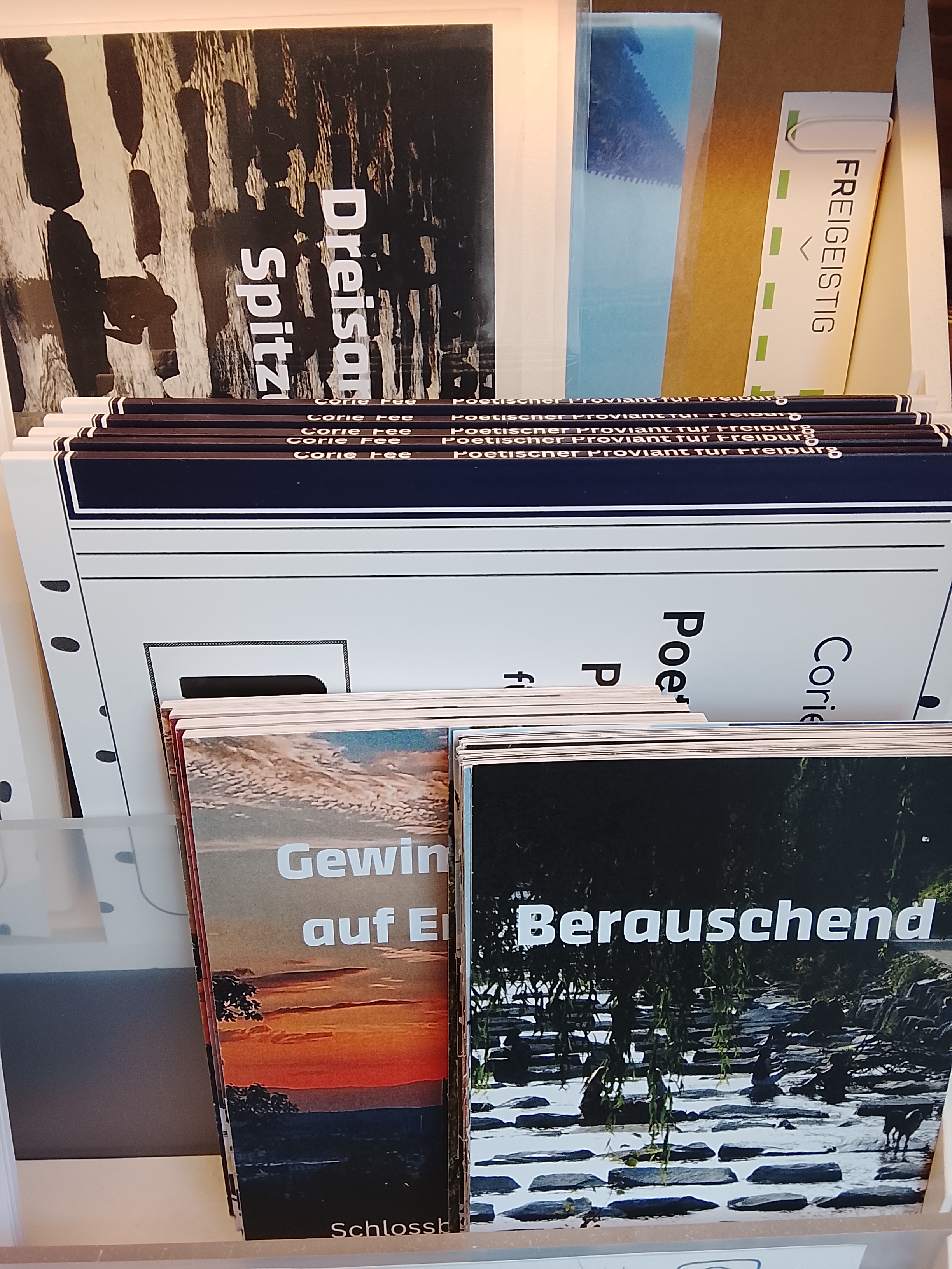 Elf weitere Freiburg Gedichte und wortspielerische Local Lyric finden sich im Gedichtband „Poetischer Proviant für Freiburg“ von Corie Fee.
