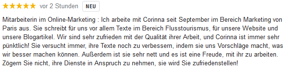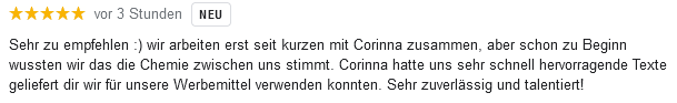 „Hallo Corinna, vielen Dank für die schnelle Bearbeitung und die tollen Texte. Haben keine weiteren Korrekturen, die Texte passen einfach perfekt.