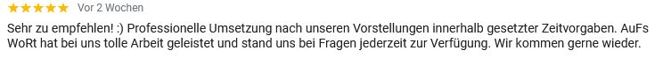 Es ist schön, zu erfahren, wie die unique erstellten Texte und optimierten Inhalte bei Auftraggebern sowie Lesern ankommen. AuFs WoRt freut sich über aufschlussreiches Feedback und motivierende Rückmeldungen.