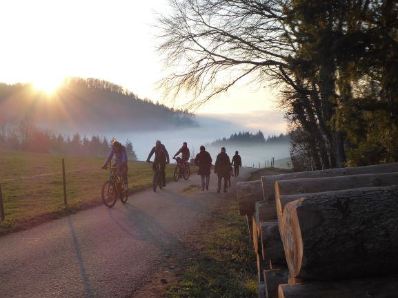 Morgenstund‘ hat Blick im Mund. So heißt es, wenn man sich noch vor dem Sonnenaufgang um 4:30 Uhr aus dem Schlafsack quält und zu Fuß hinauf auf den Belchen, 1414 Meter hohe Erhebung im Schwarzwald, steigt. Der Blick reicht an diesem schönen Morgen, den wir mit wenigen anderen Schaulustigen teilen, bis hin zu den Alpen. Wir blicken auf Basel, auf den Rhein, die Vogesen und Breisach und sind bereits um 9 Uhr, einer Zeit, in der man sich sonst gern nochmal auf die andere Seite dreht, so voll mit Eindrücken und Weitblicken, dass es bereits wieder an den Abstieg geht. Mit dem schönen Gefühl, den Tag immer noch vor sich liegen zu haben!