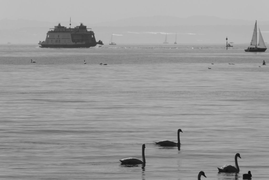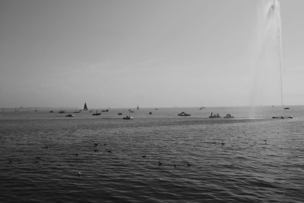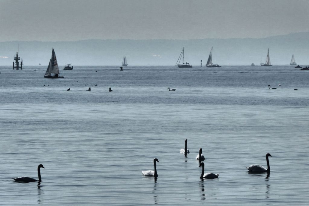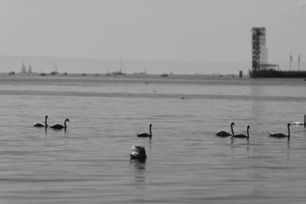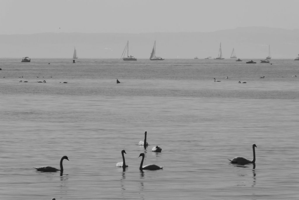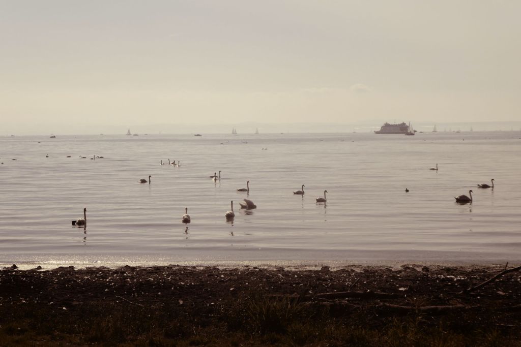 Ein wunderbarer Tag im Spätsommer. Die Idee, den Bodensee zu genießen haben noch andere. Auf dem See ist mächtig was los. Die 536 qkm Fläche teilen sich vorwiegend Segler, Fährboote, Tretboote und Schwäne. Unser Wunsch, sich ein Stück um den See – oder auf dem See – zu bewegen, bleibt zunächst unerfüllt. Sämtliche Zweiräder sind verliehen, für das Kanu ist die Zeit zu weit vorangeschritten, die Tretboote sind reserviert. Auf Umwegen, entlang der Rotach, suchen wir eine weitere Fahrradstation auf. Diese enttäuscht uns nicht. Wir radeln beseelt zum Strandbad Friedrichshafen und springen dort ins erfrischende Nass, das sich großzügig und mit Blick bis zu den Alpen vor uns offenbart. Die Badeplattform haben wir komplett für uns und genießen die milde Abendsonne und das Glitzern auf der Wasseroberfläche. Wie es in Friedrichshafen Tradition ist, fliegt ein Zeppelin über uns hinweg. Wunderschönes Flair.