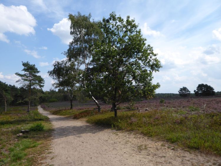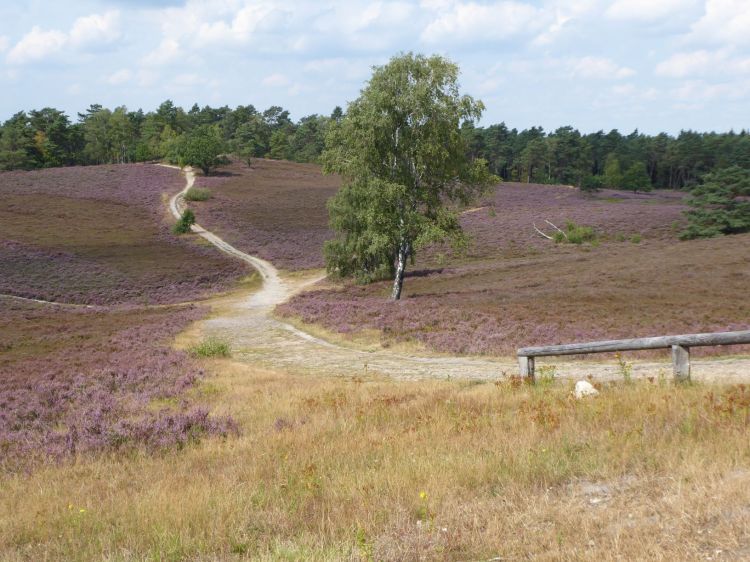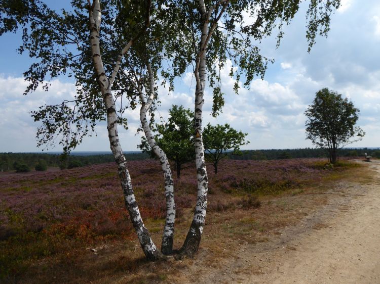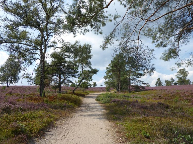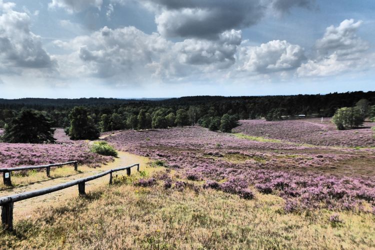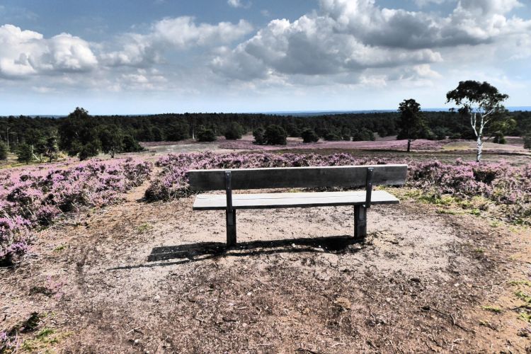 Gerade eben noch spazierten wir durch den Wald und unvermittelt erstreckt sich vor uns die üppig lilafarben blühende Heide. Wir sind in der nördlichen Lüneburger Heide, mit dem Ziel, den Brunsberg zu besuchen. Obwohl die Erhebung mit ihren 129 Metern moderat zu erklimmen scheint, ächzen wir an diesem Sommertag ganz schön. Die hohen Nadelbäume, die eben noch den Weg säumten, uns großzügig Schatten spendeten und für Kühle auf der Haut sorgten, sind schlagartig durch die offene Heidefläche abgelöst. Wir folgen dem Sandweg auf die Erhebung hinauf und werden, oben angekommen, mit einem 360 Grad Heide-Panorama belohnt. Hier auf der Bank werden wir eine Weile verweilen und den herrlichen Ausblick genießen. Im nahen Bereich fällt der Blick auf Besenheide und Sandbirken, in der Weite können wir den Wildseder Berg ausmachen sowie die Harburger Berge. Wechselnde Besucher kommen hinauf auf den Brunsberg. Ein Radfahrer, der nach eigenen Aussagen keinen Tag verstreichen lässt, ohne hier oben vorbeizufahren. Eine 5-köpfige Gruppe englischsprachiger Jugendlicher, die begeistert Smartphone Fotos machte. Eine still vergnügte Wandererin.