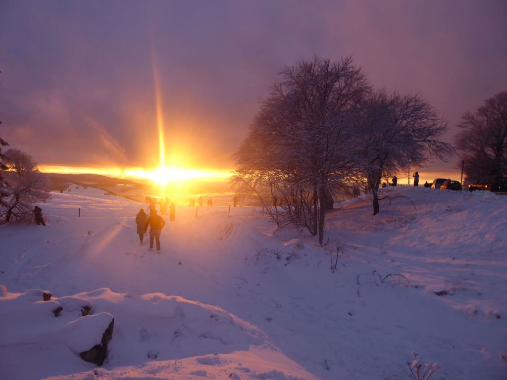 Unten Herbst, oben Winter. Ganz Freiburg macht sich an diesem Dezembertag mit Schlitten und Schaufeln bewaffnet auf den kurvigen Weg in die Höhen – auf den 1.284 Meter hohen Schauinsland. Rodeln, spazieren, glitschen, Schneeballschlacht und Schneemann bauen. Wer sich warm angezogen hat, kann es stundenlang aushalten. Und das Aushalten lohnt sich doppelt. Spektakulär geht die Sonne über Freiburg an diesem Abend unter. Und kaum möchte man wieder ins Tal zurück.